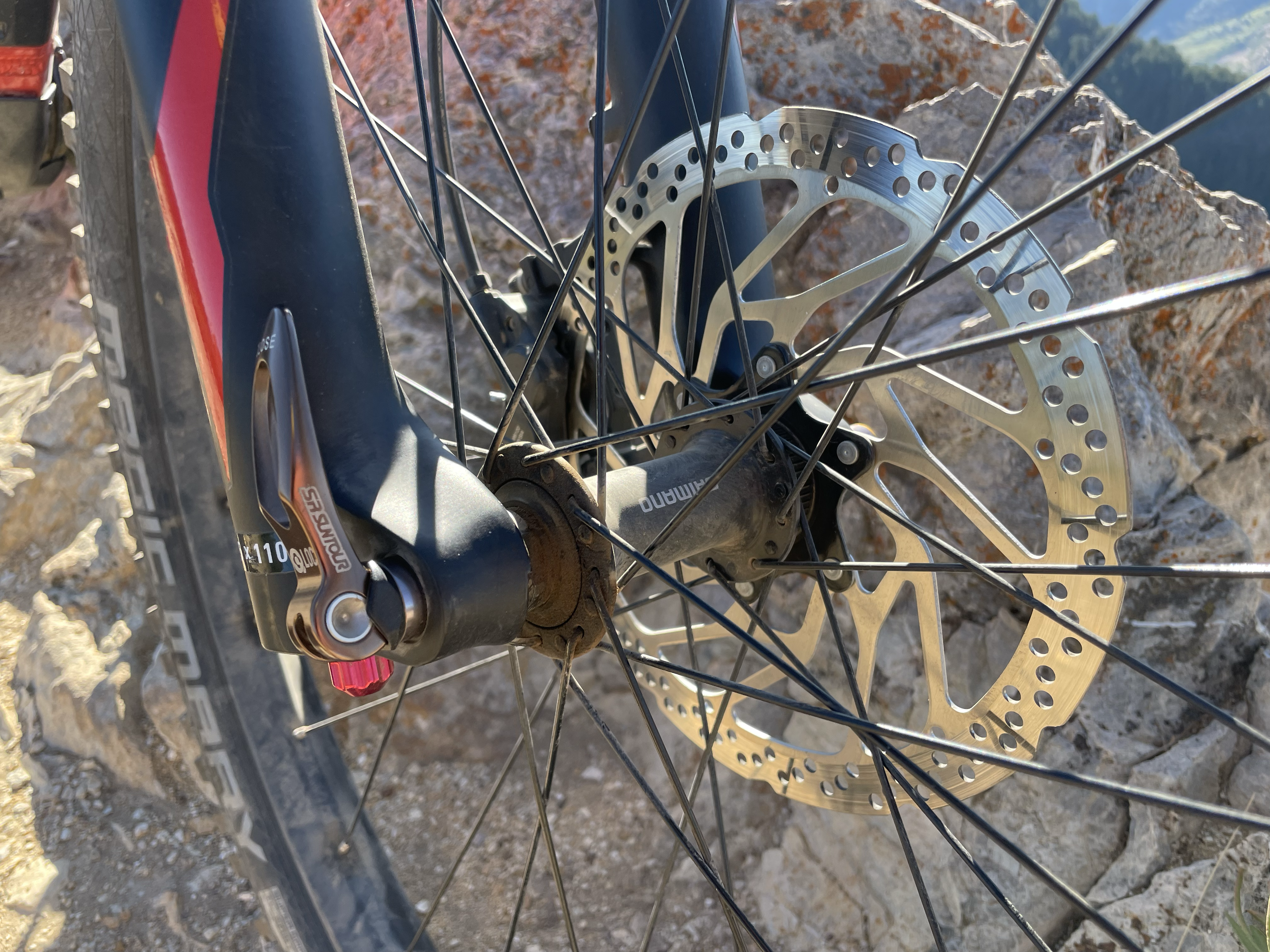 The 4-piston Shimano brakes fitted to the Copperhead Evo were some of the best I’ve used. Powerful enough to bring 220lbs to a very quick stop. There were a few times when I didn’t see a banked hairpin until about 15-12 feet before the turn… didn’t go off trail, or OTB. Go 4-piston power!