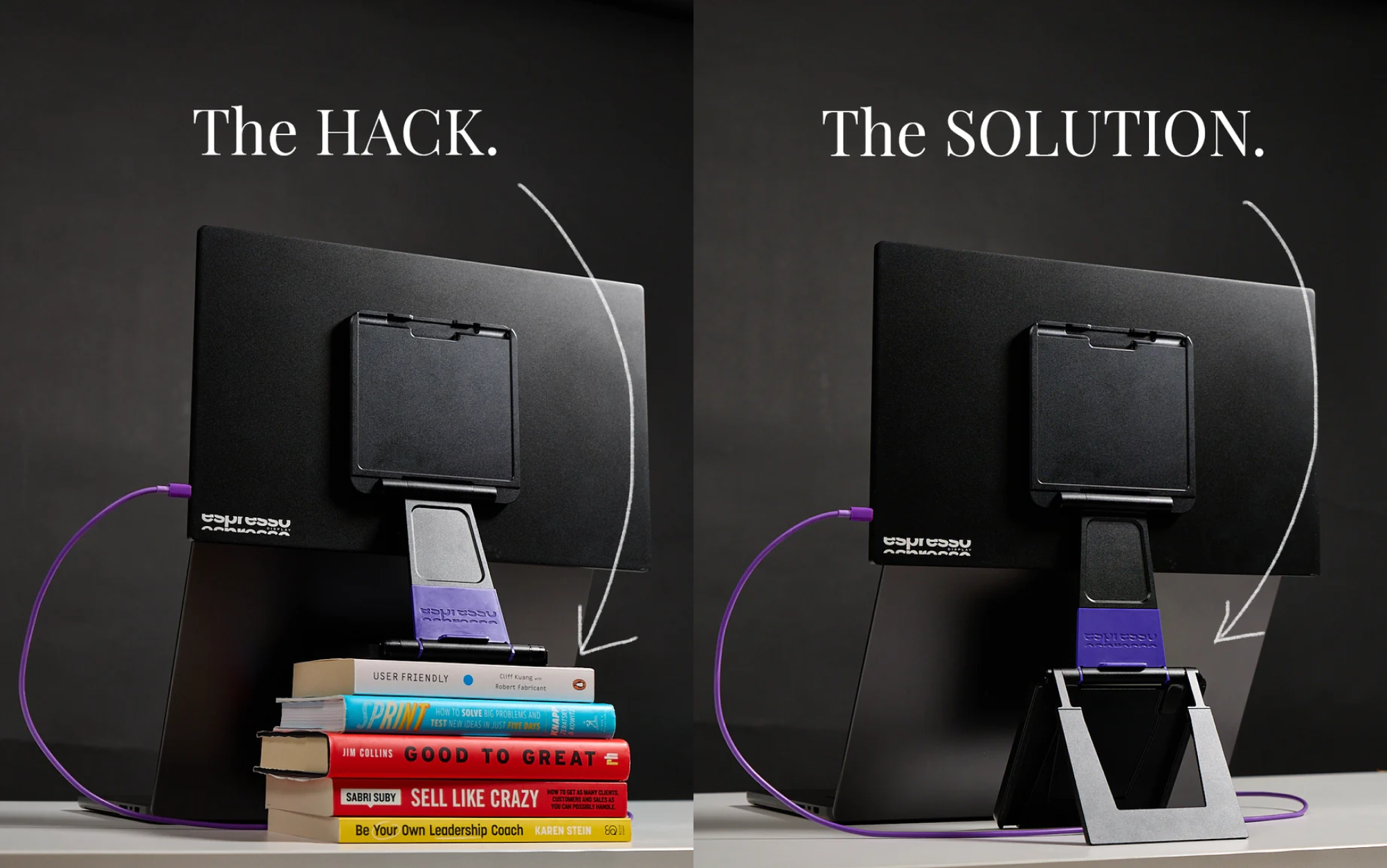 To fully extend the stand, you start by unfolding the stand as usual, but instead of placing it with a flat base, you pull open the Y-split feet to built into the base for full height. What I love the most is that you can position your computer to lean against the “chin” of the screen to completely hide it and get a more seamless experience from your computer to the espresso display.