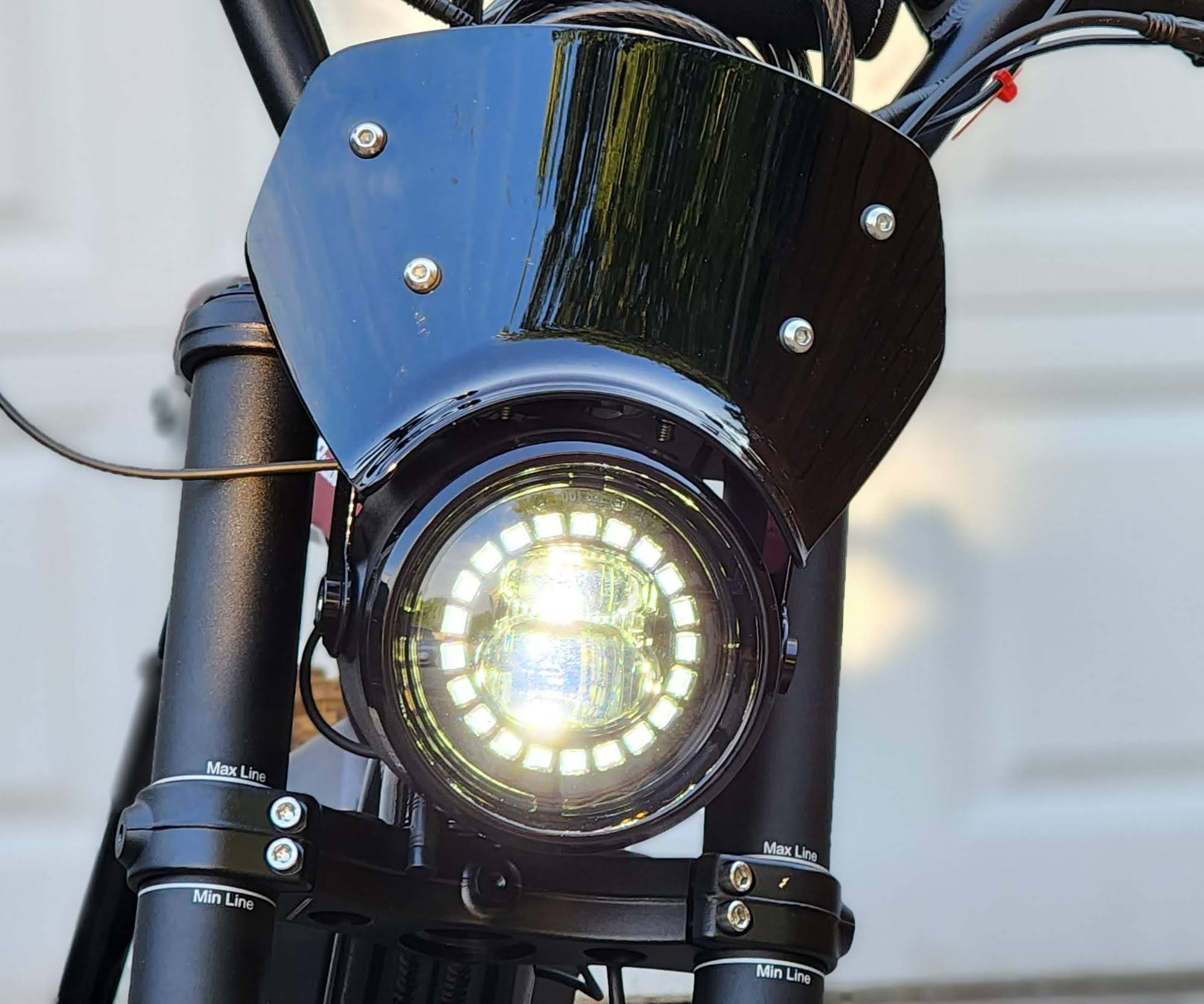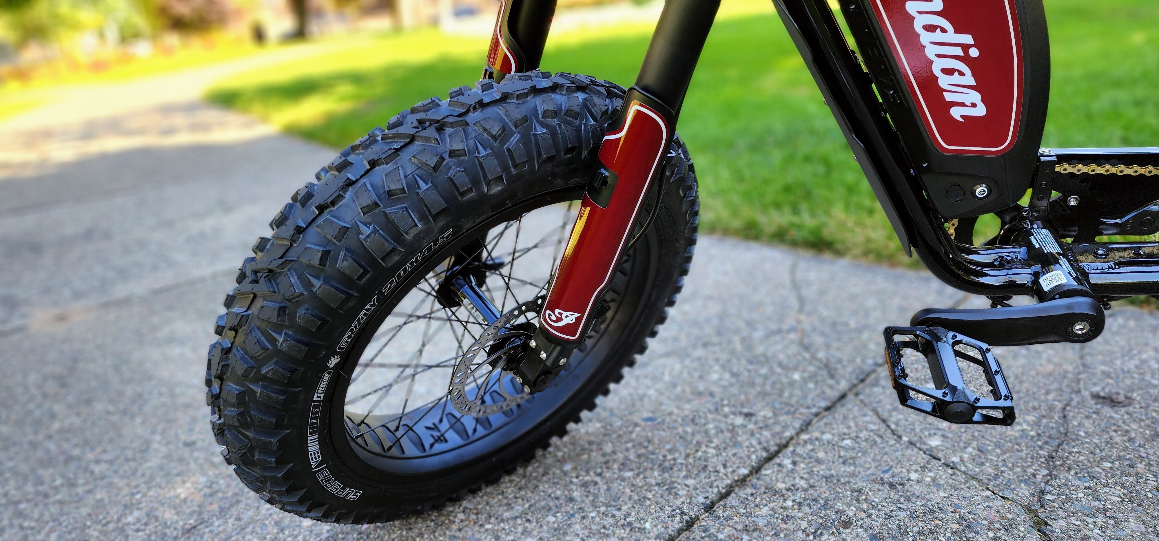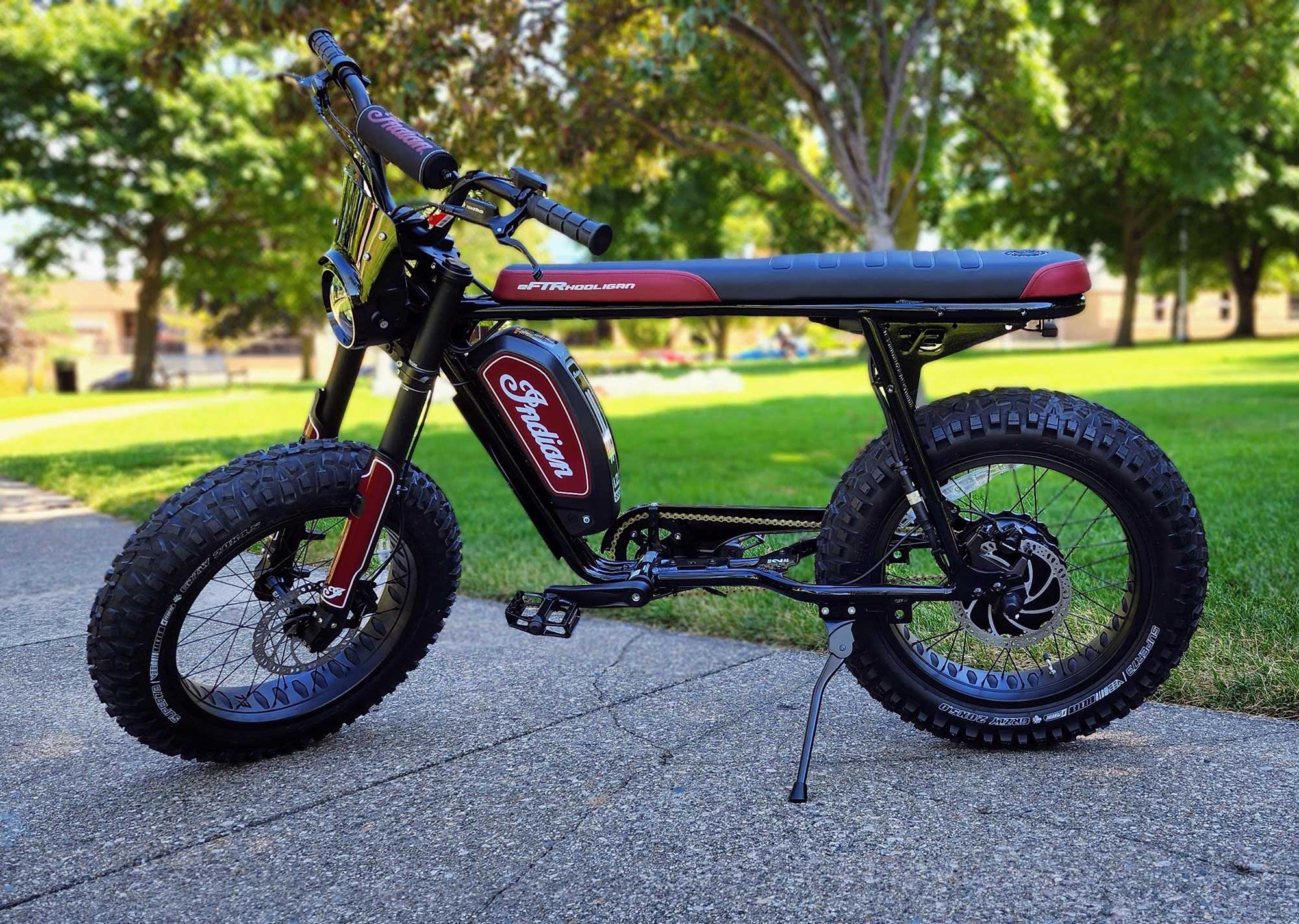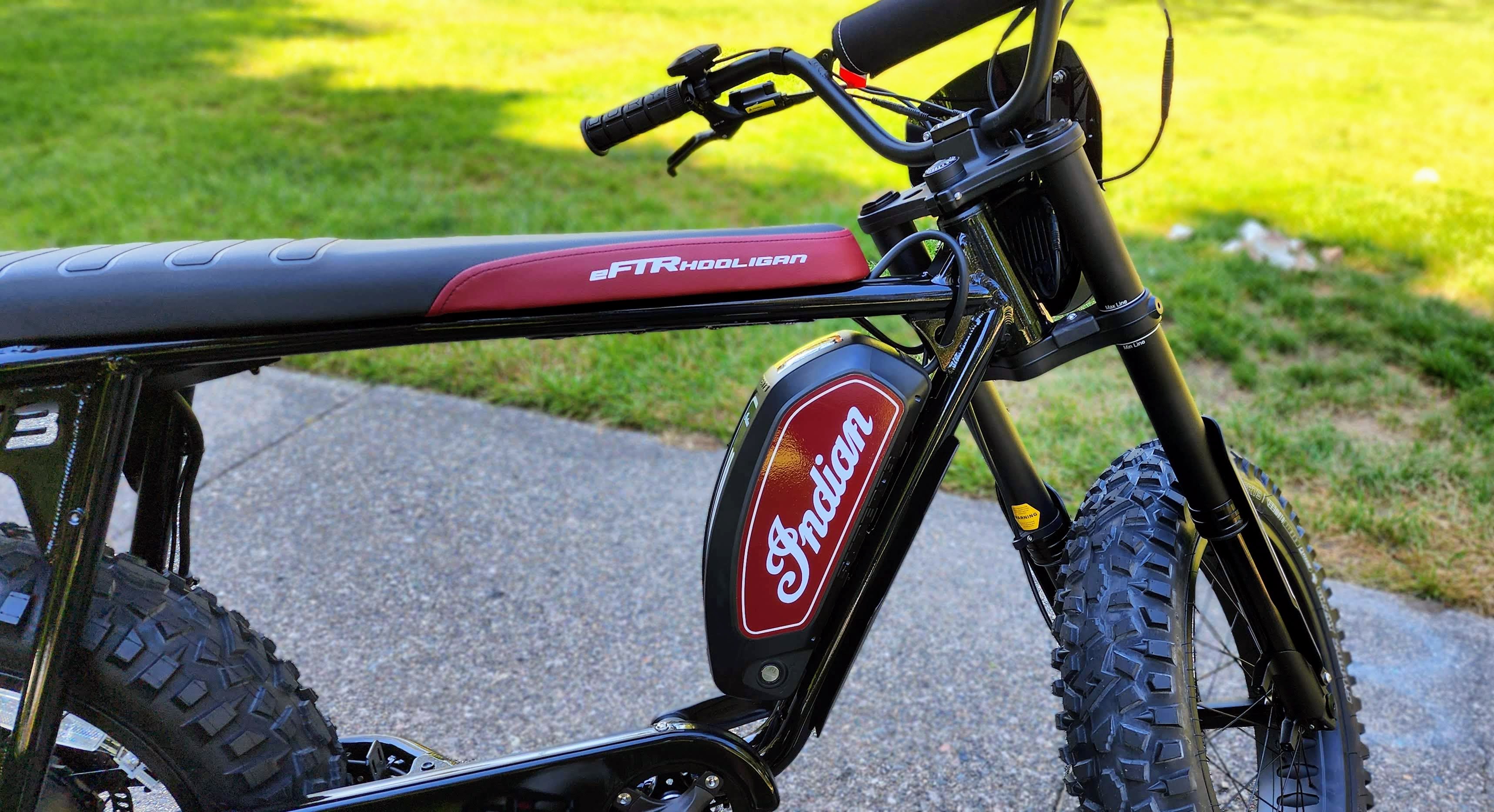 The EFTR Hooligan 1.2 has a fun design that captures the essence of classic American motorcycles with a modern electric twist. Its sleek and aggressive design is a head-turner, and the attention to detail is apparent in every curve and component. The mix of retro and contemporary elements is executed flawlessly, making this bike a statement piece on and off the road. Under the hood… or battery, this is a Super73 bike, but with a splash of Indian Motorcycle throughout. Including, the inverted Indian front forks, mid-height handlebars with Indian pad, LED light with Indian FTR style wind reflector, Indian seat, Indian battery cover, Indian chain guard, and aggressive tire treads for some light off roading.