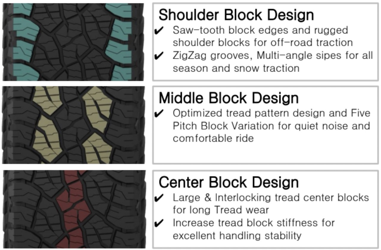 - Three-tread design reduces the compromise of typical all-terrain tires