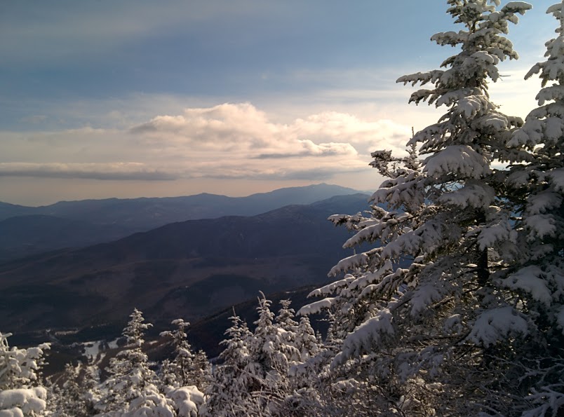 On our way up the mountain, there was a small, steep segment of ice that was covered in a couple inches of snow. It probably would have made more sense to use microspikes or crampons during this small part of the trail, but I figured this would be a good test for these snowshoes. The first two attempts I made to climb up the ice failed, and I slid down. Underneath the snow was a thick layer of ice that was very solid, and the pivot crampons on the front of the binding had trouble digging in. However, on my third try, I really tried to slam and dig the crampon into the ice and made it up. The path on the bottom of the image that heads off to the left is the part where I slid.