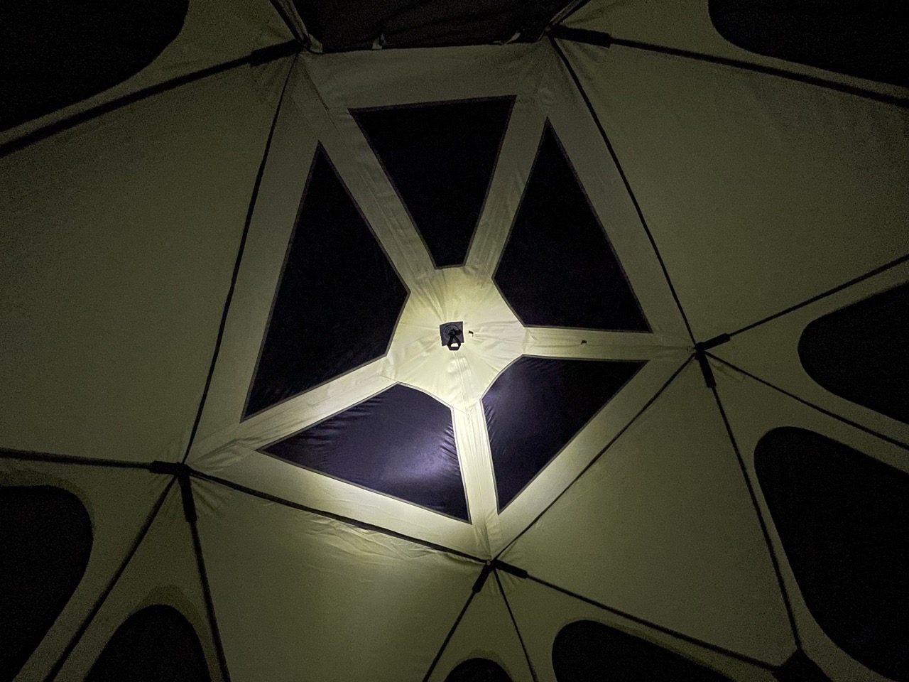Inside, looking up with rainfly on and airflow vents closed