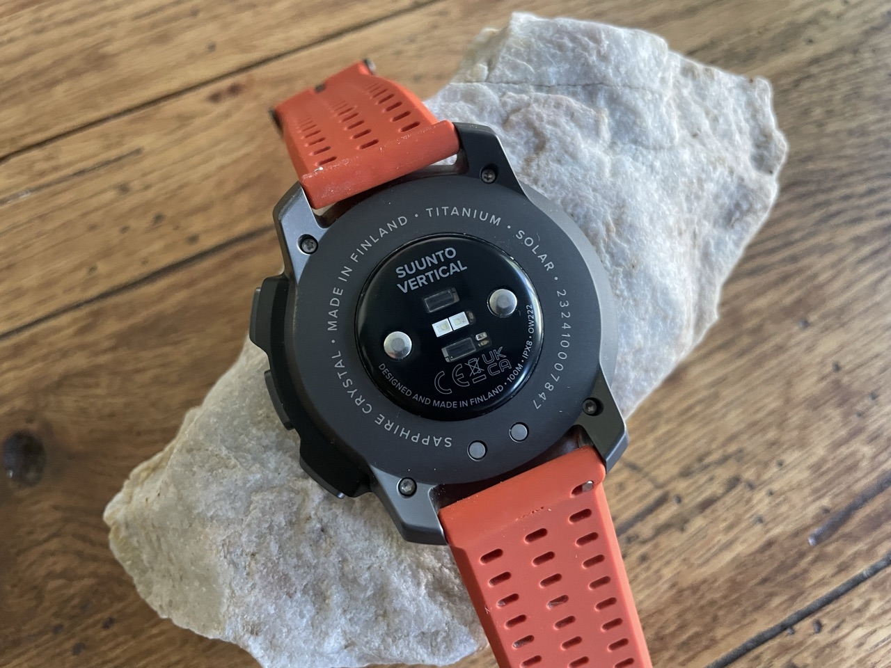 Flip the Vertical over, and you’ll find a similar backing to that of previous Suuntos. Charging leads, a few sensors, and watch technical details.